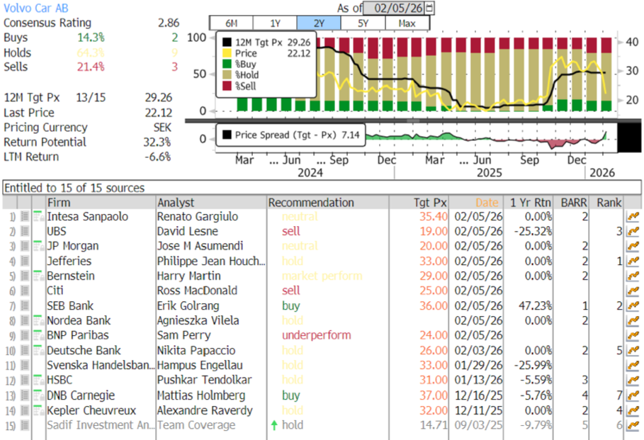 تحلیلگران وال استریت نسبت به ولوو نزولی دارند. فقط 2 “خرید” با 9 “نگهداری” و 3 “فروش” وجود دارد.