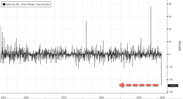 - پس از اینکه درآمدهای سه ماهه چهارم انتظارات را از دست دادند، سهام ولوو تا 25 درصد سقوط کرد و بدترین افت روزانه سهام از زمان عرضه آن در سال 2021 را نشان داد.