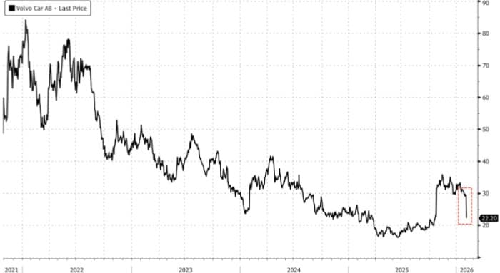 سهام ولوو کارز بیشترین سقوط را در استکهلم ثبت کرد و دادههای بلومبرگ به اواخر سال 2021 بازمیگردد، پس از گزارش درآمدهای سه ماهه چهارم که انتظارات تحلیلگران را از دست داد.