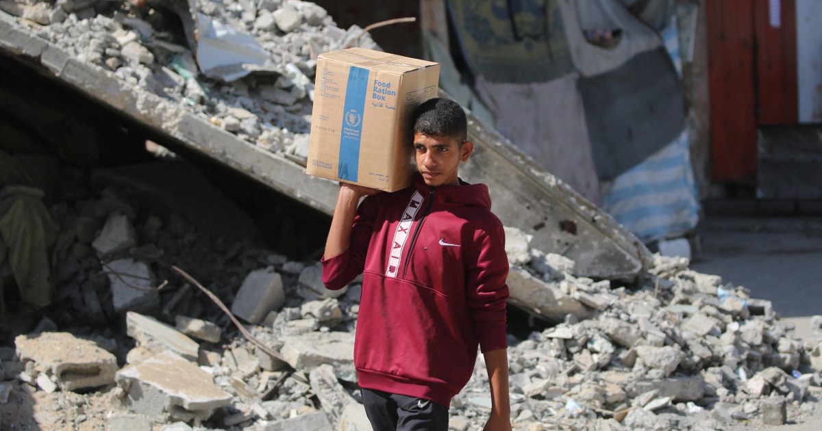 یک فلسطینی آواره روز یکشنبه یک جعبه لوازم اضطراری را از یک نقطه توزیع کمک در اردوگاه پناهندگان نصیرات حمل می کند.ایاد بابا / خبرگزاری فرانسه – گتی ایماژ