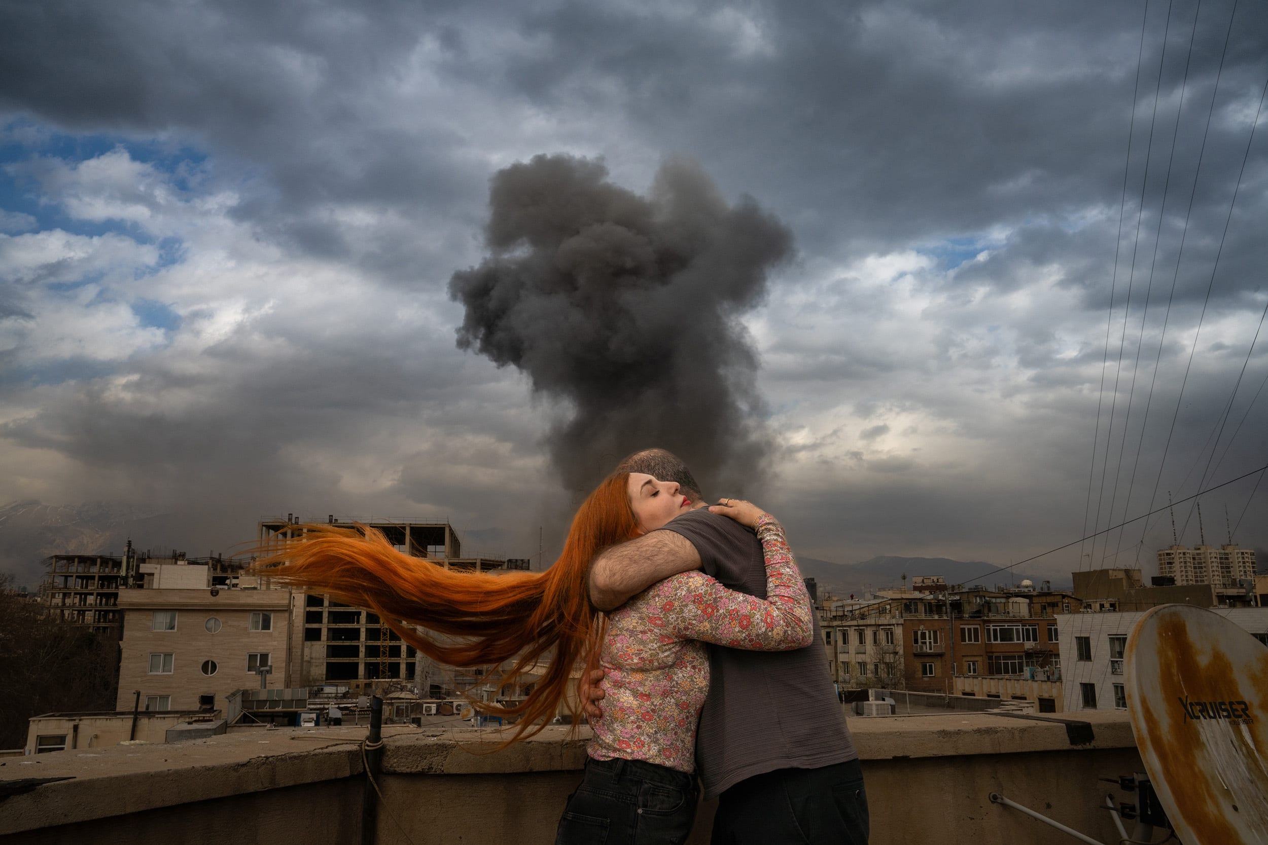 مریم سعیدپور، هنرمند مفهومی در تهران، در یک سلف پرتره ساخته شده روی لبه پشت بام نشسته است. در پرتره ای که در چند هفته گذشته گرفته شده است، دود سیاهی از پشت سر او بلند می شود، در حالی که روسری فوشیا او در باد پشت سرش می پیچد.
