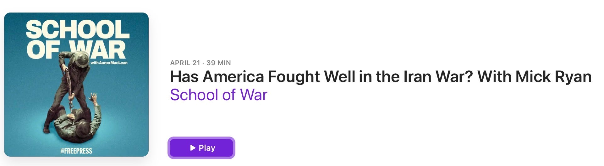 من خوش شانس بودم که مرتباً به آن دعوت شدم پادکست مدرسه جنگ و گفتگوهای فوق العاده ای با میزبان، آرون مک لین داشته باشید. آرون همیشه یک گفتگوگر عالی و یک گفتگوی عمیقاً آگاه در مورد جنگ و طیف وسیعی از موضوعات امنیت ملی است. او همچنین یک جوان خوب است.