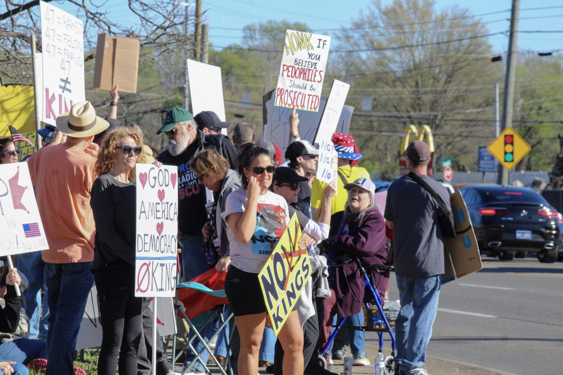 معترضان در 28 مارس 2026 در امتداد خیابان برود در اعتراض به “نه پادشاهان” در مورفریسبورو، تنسی، تابلوهایی را در دست دارند.