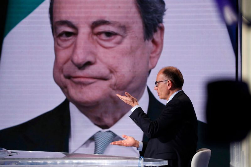 Enrico Letta در یک تابلوی صحبت می کند ، با نخست وزیر پیشین ایتالیا ، ماریو دراگی ، روی پرده سینما. (عکس توسط Massimo di Vita/Archivio Massimo di Vita/Mondadori Portfolio از طریق Getty Pictures)