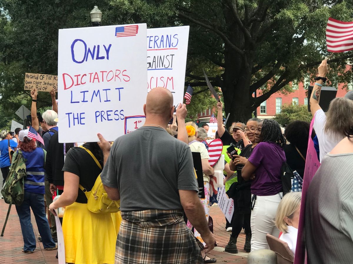 بن گرایمز از ویرجینیای شمالی که گفت دو دهه را در ارتش ایالات متحده خلبانی هلیکوپتر و کار به عنوان وکیل نظامی گذرانده است، تابلویی را در دست داشت که روی آن نوشته شده بود “من به آمریکا خدمت کردم نه خودکامگی”.
