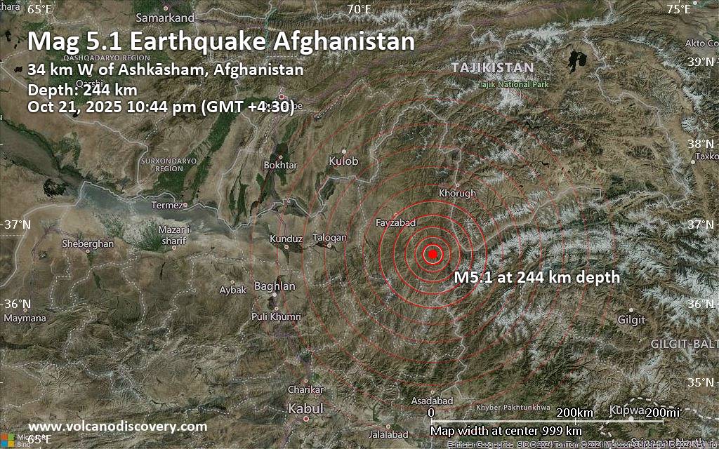 زلزله متوسط تا عمیق 5.1 ریشتر اواخر شب در حوالی فیض آباد ولسوالی فیض آباد بدخشان افغانستان گزارش شده است.