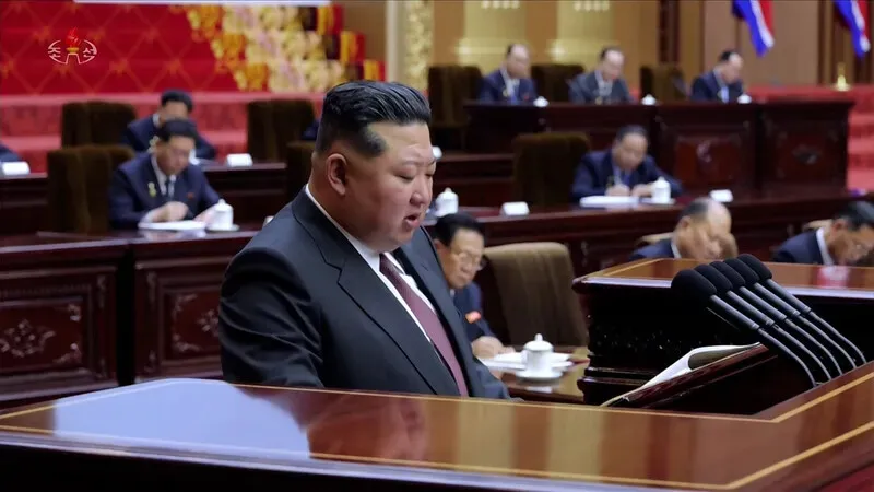 رهبر کره شمالی کیم جونگ اون در 23 مارس 2026 در برابر مجلس عالی خلق در پیونگ یانگ سخنرانی می کند. (KCNA/Yonap)