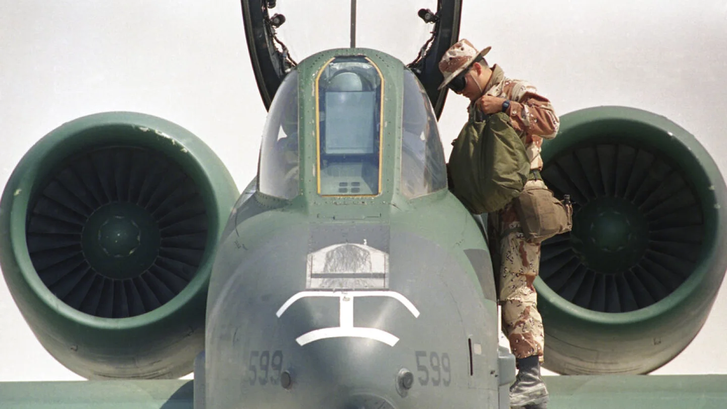 یک مهماندار خط پرواز نیروی هوایی ایالات متحده در روز چهارشنبه 29 آگوست 1990 در عربستان سعودی یک جت A-10 را قبل از پرواز بررسی می کند. این هواپیماها با نام مستعار Warthogs یک دفاع اصلی در برابر تانک ها هستند. (AP Photo/David Longstreath)