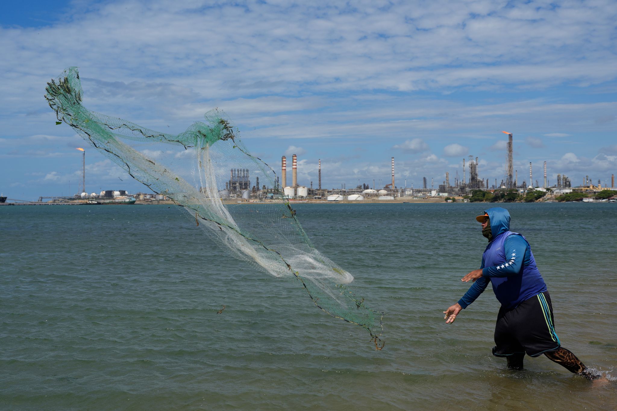 پرونده – یک ماهیگیر تور خود را با پالایشگاه نفت کاردون در پسزمینه در Punta Cardon، ونزوئلا، 14 ژانویه 2026 پرتاب میکند.